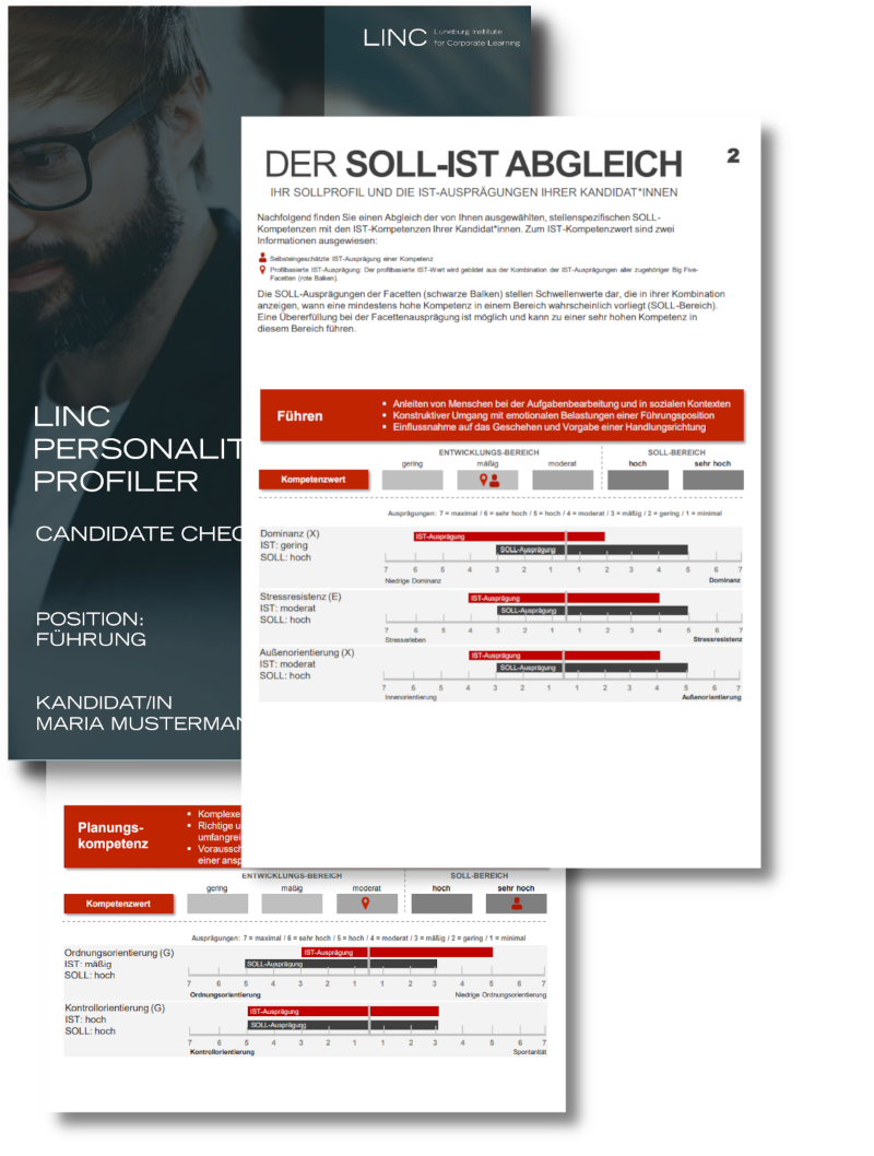 Die eigene Persönlichkeit besser verstehen und Selbstreflexion anstoßen. Der ca. 30-seitige individuelle Report enthält die Dimensionen der Big 5-Charaktereigenschaften, die Motivstruktur und Kompetenzen sowie Handlungsimpulse für die Bereiche Kommunikation, Arbeitsstil, Verhandlung und Führung. Ergänzend gibt es Hinweise zur Fremdwahrnehmung (Wie wirke ich auf Andere?) sowie zum Lernen von Anderen (Was kann ich von anderen Stilen lernen?).